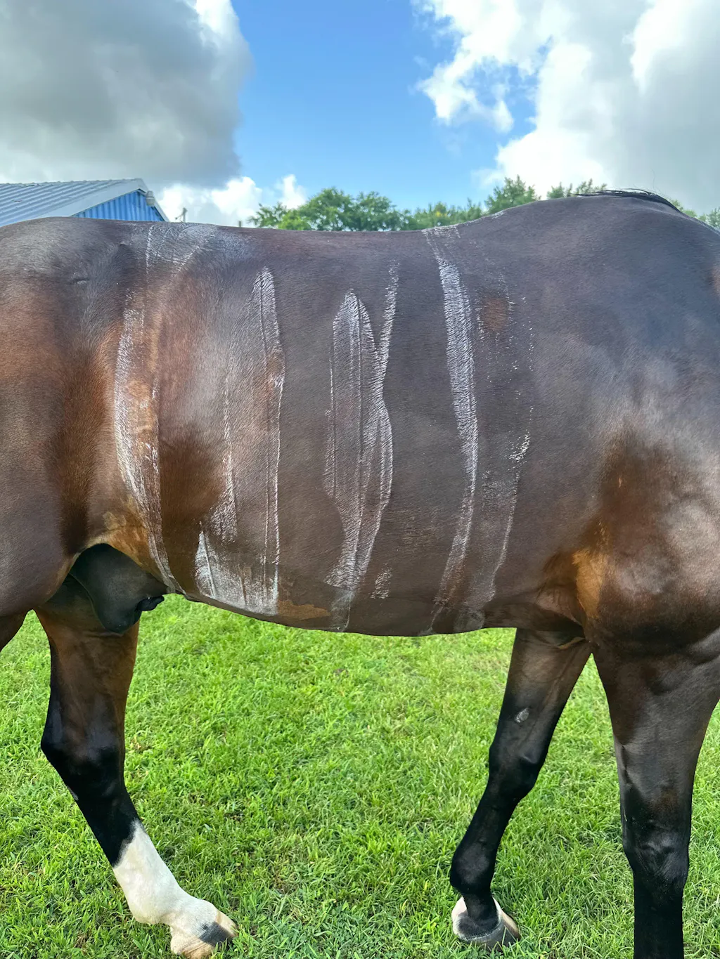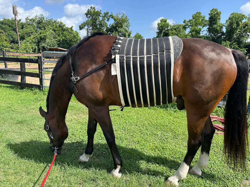 Sinco had colic surgery on June 4th, 2025. He is a huge Hanoverian weighing 1600lbs at 17.2 hands. His back was stressed, his shoulders were stressed and his poor skin was sticky from all the tape from bandaging. Since wearing the belt, his back and shoulders have improved noted by his bodyworker and the swelling around the incision has been reduced. Sinco is happy day and night on stall rest with his hernia belt. Thank you!!!